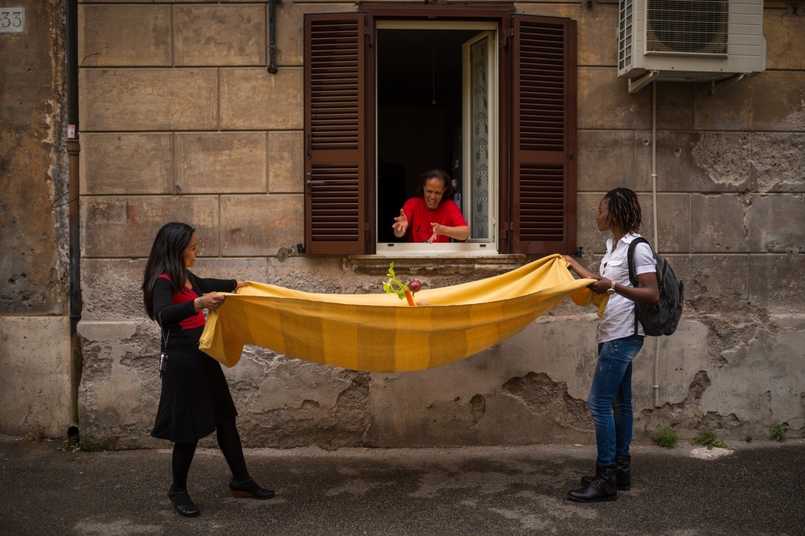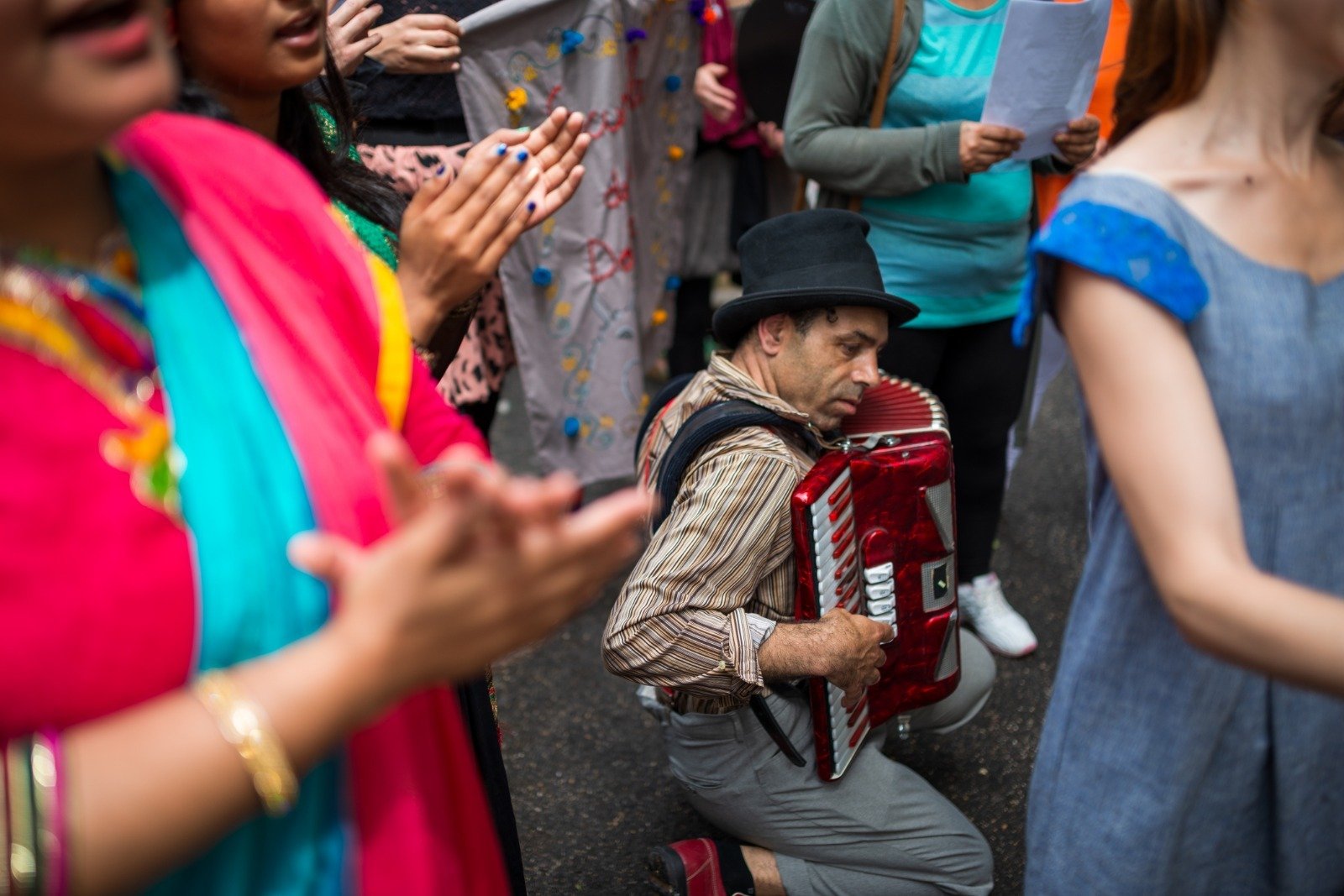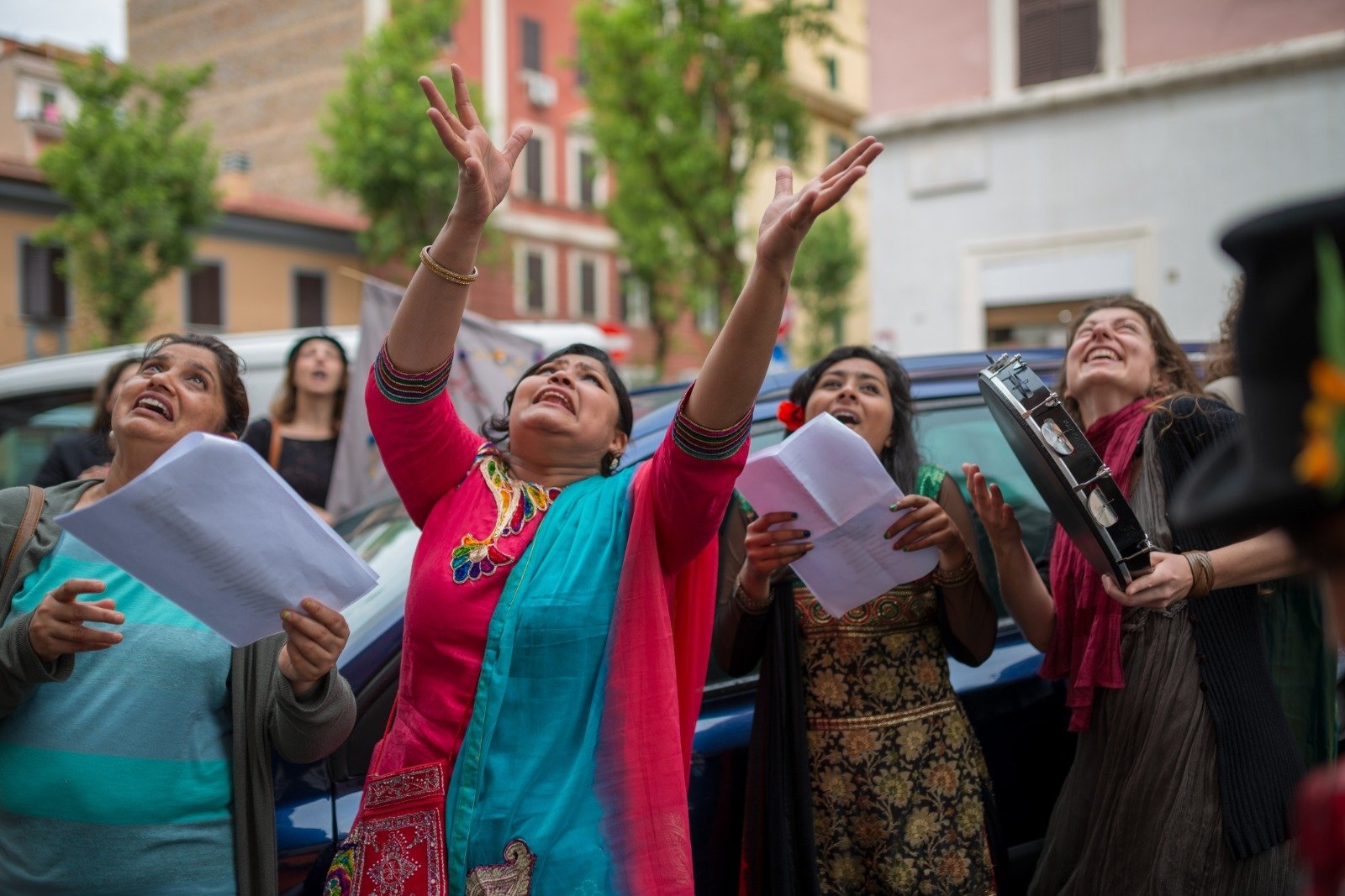 Foto: Marcello Scopelliti – Banda del Minestrone, un ensemble che scambia canzoni e poesie in cambio di verdure da trasformare poi in minestrone consumato collettivamente in strada dagli abitanti del quartiere di TorPignattara, Roma. Iniziativa a cura dell’Associazione “Alice nel Paese della Marranella”.