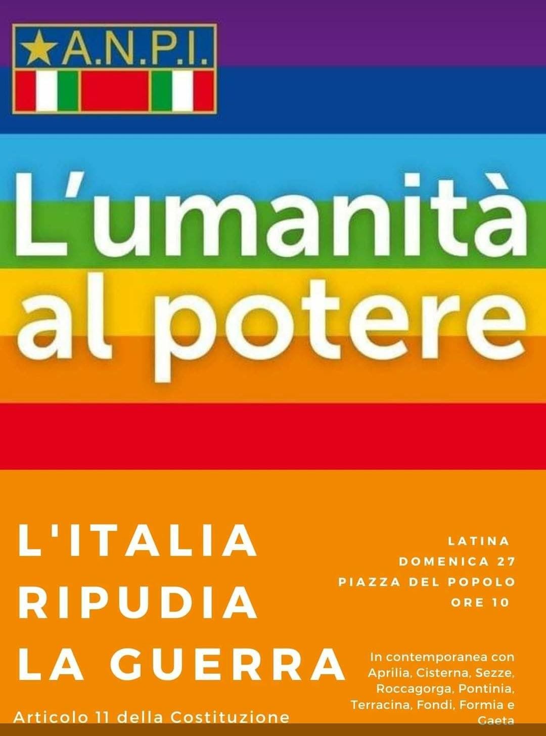 Anche per questo manifesteremo su invito dell’A.N.P.I. domani alle ore 10 in Piazza del Popolo a Latina per un immediato cessate il fuoco, per la pace in Ukraina e soprattutto per riportare l’Umanità al Potere. Sempre e ovunque.
