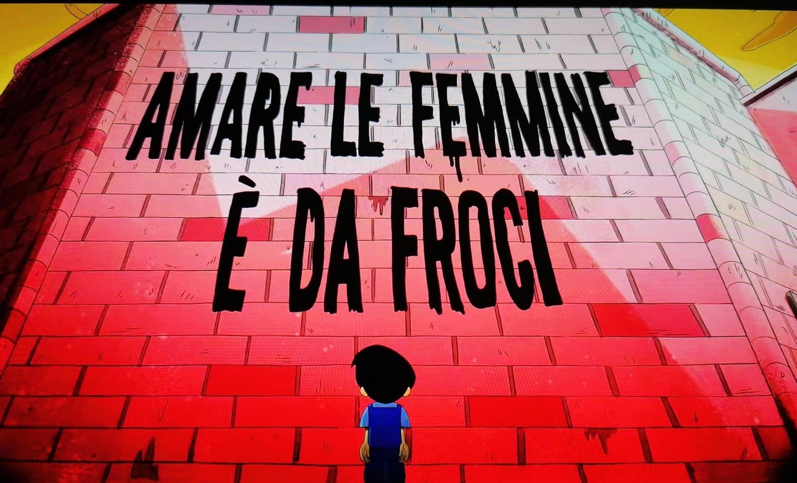 PS: la pubblicazione del fotogramma con il murale di Zerocalcare mi è costata un ban di tre giorni da Facebook, con la motivazione di incitamento all’odio. Non hanno colto l’ironia, insomma. Ennesima conferma dei limiti di un pensiero binario – come l’algoritmo che lo incarna – nell’interpretare un mondo reale fatto di gradienti e sfumature, come quello che invece viviamo fuori dai social.