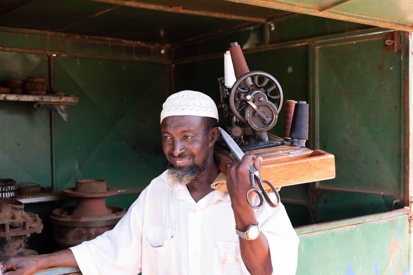 Quest’uomo gira per le strade di Ouaga, a piedi, con la sua macchina per cucire sulla spalla, in cerca di clienti che abbiano bisogno di una piccola riparazione. Quando trova un lavoretto da fare, si ferma, fa un orlo o ripara uno strappo, seduto dove può, magari sotto un albero per avere un po’ di ombra. Finisce il lavoro, si rimette la macchina in collo e riparte. Sotto il sole, col vento, con la pioggia. Cammina, cammina e magari ci sono giorni che nessuno ha bisogno di lui. Quando lo abbiamo incontrato era un torrido pomeriggio di agosto: noi a spasso ad esplorare la città, lui in cerca di lavoro. Quando ha visto che Giuseppe voleva fotografarlo, ci ha sorriso timido ma dolce. Chissà come era andata quella giornata. Ma lui si è fermato e ci ha sorriso. Senza sapere chi fossimo e perché eravamo lì. Senza aspettarsi nulla in cambio. Si è appoggiato un attimo al bancone di una bottega e ha permesso a Giuseppe di fotografarlo con calma. Lo abbiamo ringraziato e lui ci ha sorriso ancora, lo abbiamo seguito con lo sguardo mentre si allontanava. È una delle persone che ci è rimasta nel cuore, di quelle tante persone che abbiamo incrociato per un attimo o per più tempo. Sono tutti con noi, nei nostri occhi, nel nostro cuore, nella nostra anima. Noi così piccoli, di fronte alla loro grandezza, al loro coraggio, alla loro perseveranza, alle loro mani ferite, ai piedi stanchi, alla schiena curva, ma sempre fiera. Noi qui, a testimoniare che ci siete, che esistete, che sognate ed amate. E che ci avete sorriso, immensamente.
