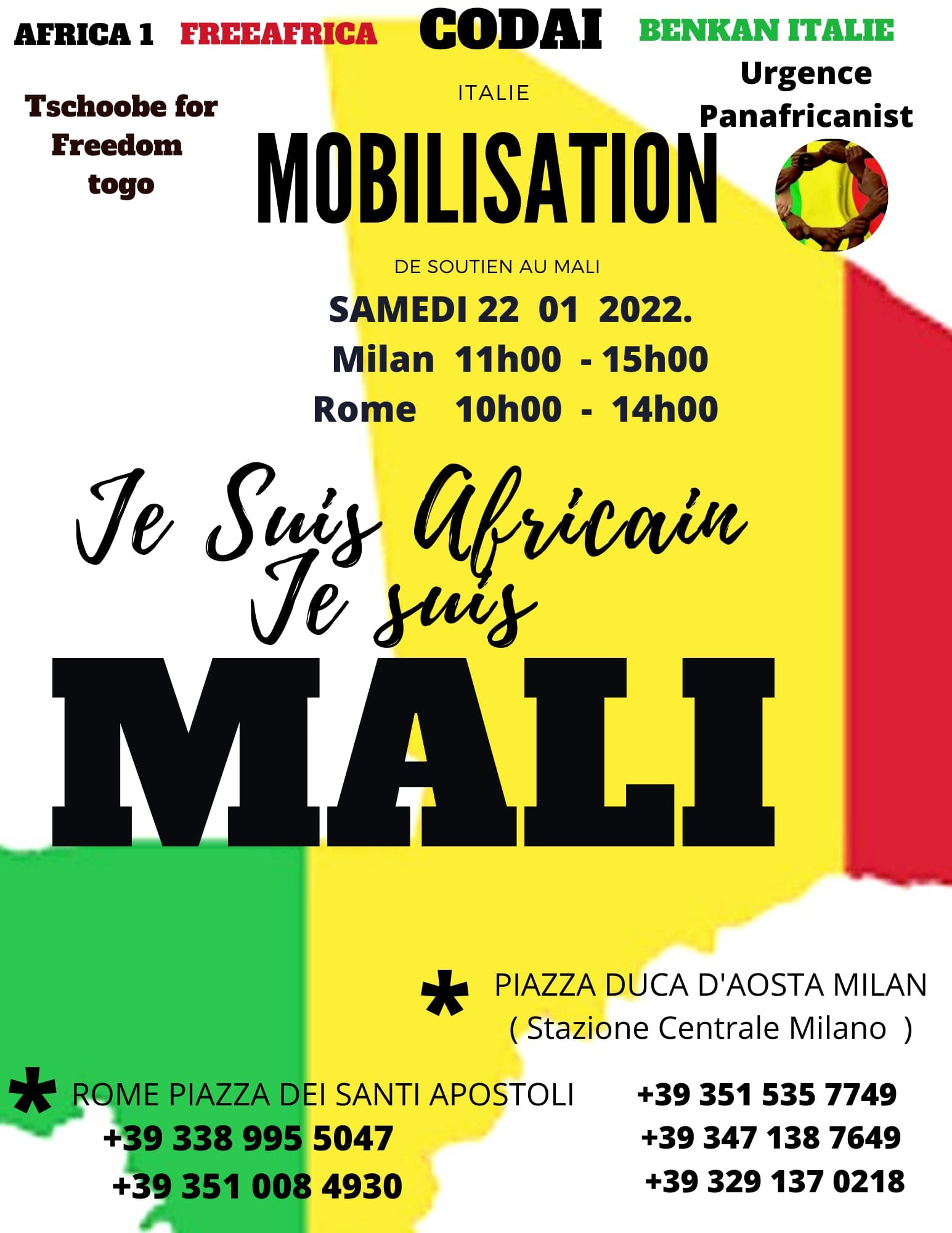 M. Sabato 22 Gennaio 2022 c’è una mobilitazione internazionale in sostegno del Mali: saranno molte le piazze nel mondo, in Italia l’appuntamento è a Roma in Piazza dei Santi Apostoli e Milano, in Piazza Duca D’Aosta.